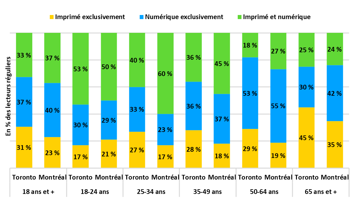 22. Répartition des lecteurs réguliers (lu hier en semaine) de quotidiens à Toronto et à Montréal selon le support et les groupes d’âge en 2023